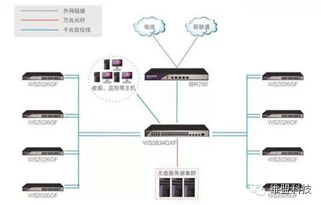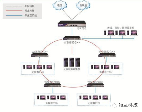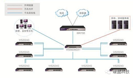 网吧经过近20 年的发展至今,行业内的竞争越来越激烈,网吧的规模也从最初的几台PC,到现在的上百台,甚至于上千台。为了能够在激烈的竞争中立足,如何平衡网吧整体性能和成本成为了成了网吧业主的首先要考虑的问题。 据调查,85.7%的网民在选择一家网吧时最看中是上网速度、稳定和安全。同时网吧系统与游戏的运行速度是影响网民上网体验的重要环节,如果游戏速度和系统启动速度不够快,PC 配置再高,装修再豪华,网民也一样认为该网吧没有吸引力。 针对上述网吧用户需求,以及不同规模网吧的行业特征,维盟(WAYOS)推出了如下三种网吧万兆网络解决方案: (1)第一代万兆方案:IBR700网吧智能路由器+WS5834GXF+核心交换机+WS2026GF分支交换机,适合150台以内的中、小规模集中式网吧,投资回报率高; (2)万兆主干核心+千兆汇聚方案:IBR700网吧智能路由器+WS5852GX+核心交换机+WS2026GF分支交换机,带机150台左右; (3)万兆环网方案:IBR720网吧智能路由器+WS5852GX+万兆环网交换机; 万兆环网方案经过维盟多年时间的沉淀及研发试验,目前已经得到广大网吧的亲睐,万兆环网方案现在已经是网吧改造或者新开网吧的首选,目前已经成功实现上百家万兆环网网吧并推出定制性的整体以太网解决方案。