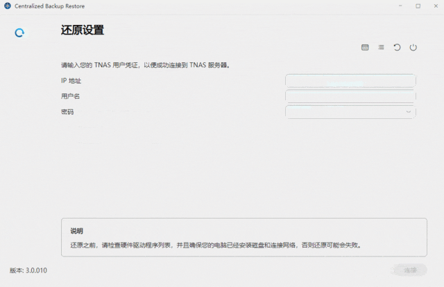 在 Windows PC 下运行启动映像。 输入您的 TNAS 凭证以连接您的 TNAS。 选择需还原的备份任务。 选择还原模式。( q4 \9 `8 O9 v: [9 @4 \· 还原整台设备(自动):自动还原已选择的整机备份,目标设备的所有数据都将会被覆盖。) |3 `9 x  ^4 y