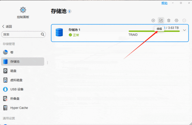 0 C) b( u; a% |+ Q4 N2 Z2、前往 至 控制面板>存储管理>存储池 点击 “编辑”按钮,在弹出的菜单中,选择“为阵列添加硬盘”,并确认相关信息;